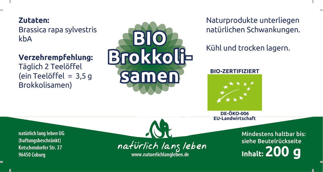 In bester Qualität werden hier die Samen des Urbrokkolis Sorte Broccoli Raab (Brokkoletti, Rapini, Brassica rapa sylvestris) verwendet. Ob als Keimling oder einfach so zum knabbern, der Vielfalt sind beim Verzehr und Verwendung keine Grenzen gesetzt. Ob Im Smoothie oder Salat, Hauptsache lecker. Der entscheidende Unterschied zu gekochtem Brokkoli ist der Sulforophangehalt, der leider beim Erhitzen erheblich sinkt. Ein Teelöffel unserer Samen enthält etwa 20 mg Sulforaphan. Schenken Sie diesem Stoff mehr Bedeutung in Ihrem Speiseplan!
