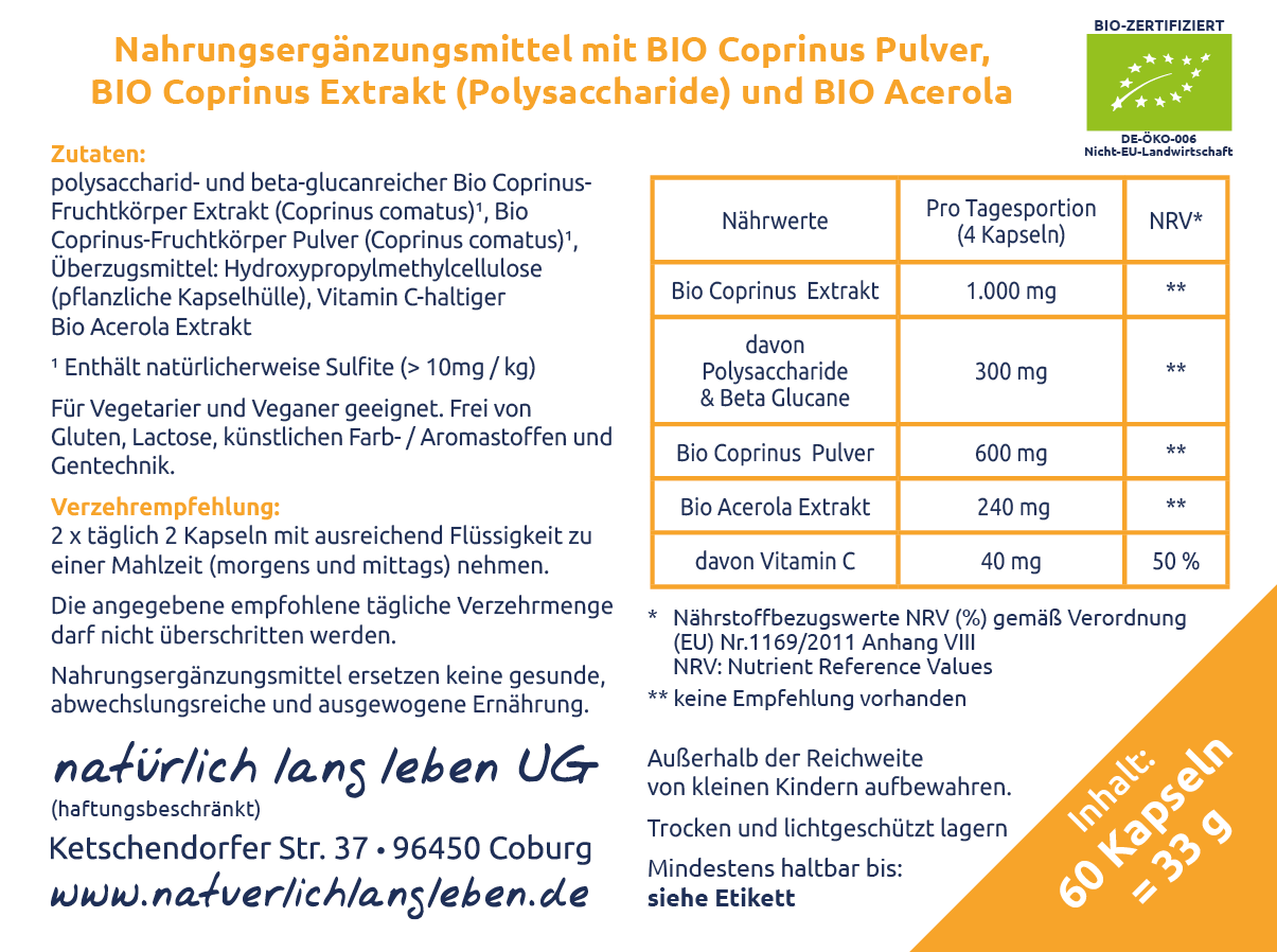 Polysaccharid-und beta-glucanreicher BIO Coprinus-Fruchtkörper Extrakt (Coprinus comatus)¹, BIO Coprinus-Fruchtkörper Pulver (Coprinus comatus)¹, Überzugsmittel: Hydroxypropylmethylcellulose (pflanzliche Kapselhülle), Vitamin C-haltiger BIO Acerola Extrakt