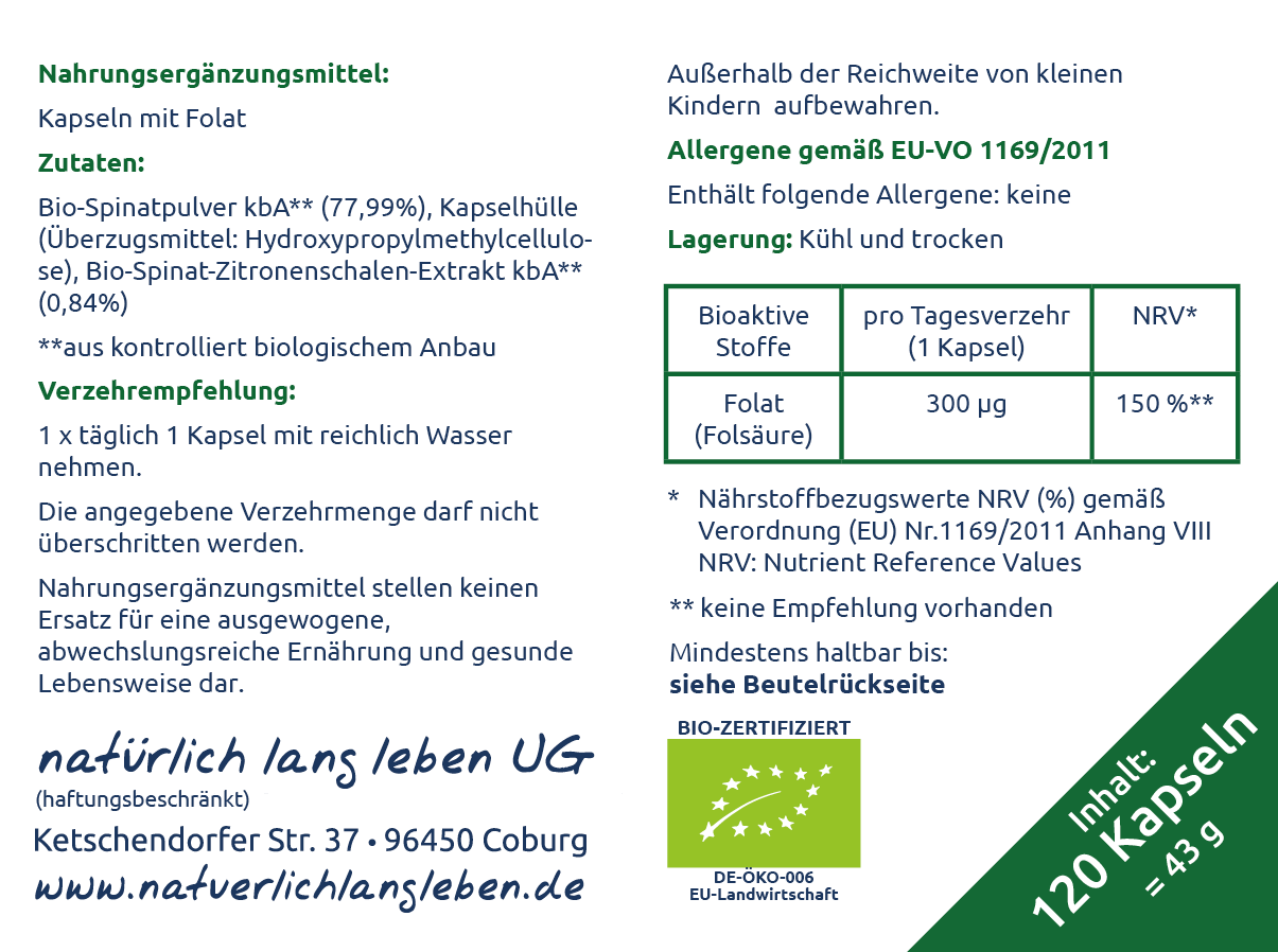 Unsere Folat Kapseln mit bestem BIO Spinatpulver aus streng kontrolliertem biologischen Anbau. Folat, auch Vitamin B9 genannt unterstützt das Wachstum des mütterlichen Gewebes während der Schwangerschaft. Es trägt zur normalen Blutbildung bei und hat eine Funktion bei der Zellteilung.