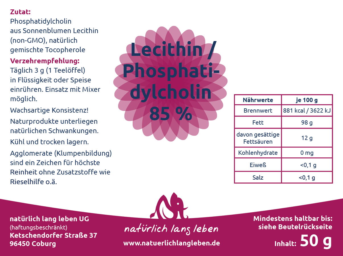 Phosphatidylcholin ist das am häufigsten in der Zellmembran vorkommende Phospholipid und schützt die Leber mit ihren 33.000 Quadratmetern Membranfläche. Lecithin ist eine Phospholipid, das in unserem Körper eine Reihe wichtiger Funktionen übernimmt. Dieser fettähnliche Stoff wird z. B. für die Bildung der Zellwände und des Nervengewebes benötigt und ist an der Energiegewinnung in den Zellen beteiligt. Außerdem ist Lecithin ein wichtiger Baustein des Neurotransmitters Acetylcholin. Obwohl unser Körper den Stoff selbst produzieren kann, ist eine optimale Versorgung über die Nahrung sinnvoll.