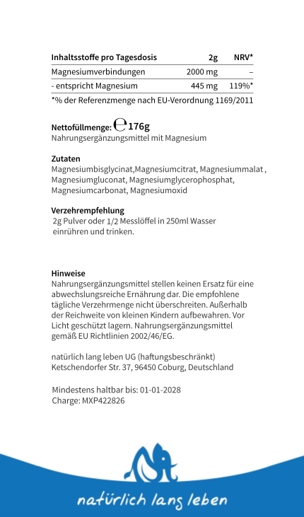 Täglich 1/2 Messlöffel in ausreichend Flüssigkeit (250 ml) einrühren und trinken. Entspricht 445 mg Magnesium pro Tagesportion.
