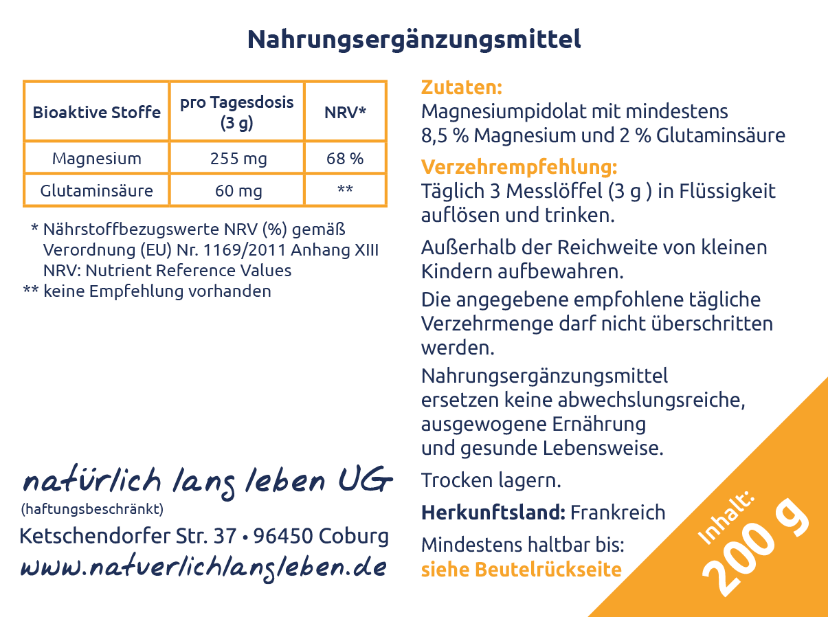 Hochwertiges Magnesiumpidolat mit 8,5% Magnesium und 2% Glutaminsäure (leicht bitter)