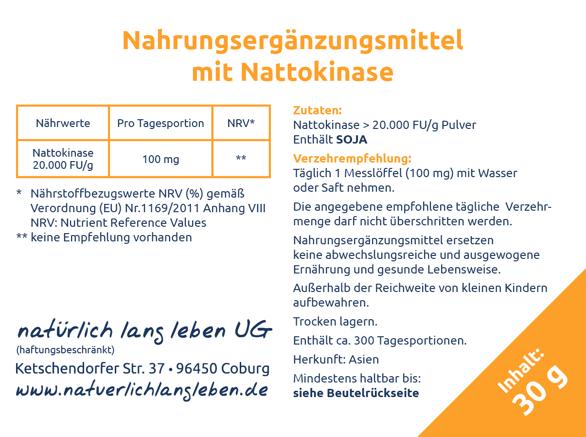 Nattokinase 20.000 FU/g Pulver, enthält Soja (GMO-frei)