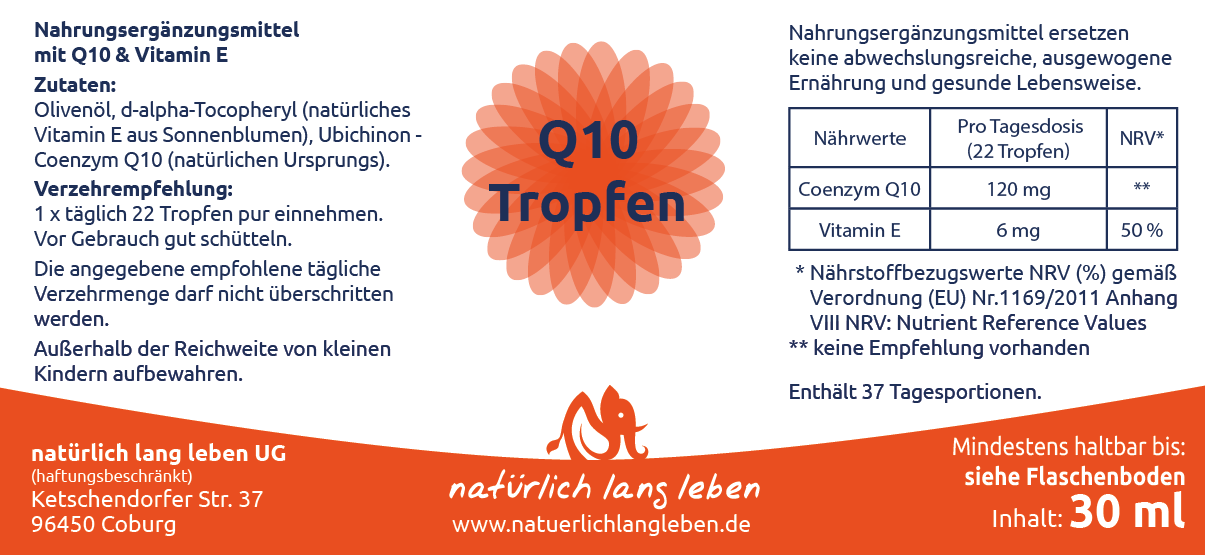 Warum unsere Tropfen mit Q10? Der Ölgehalt aus hochwertigem Olivenöl sorgt für eine optimale Aufnahme von Q10 über den Darm. Q10 zählt wie auch die Vitamine A,D,E,K zu den Stoffen, die im Rahmen der Fettverdauung resorbiert werden. Zudem rundet diese Tropfen eine Zugabe natürlichen Vitamin E ab.