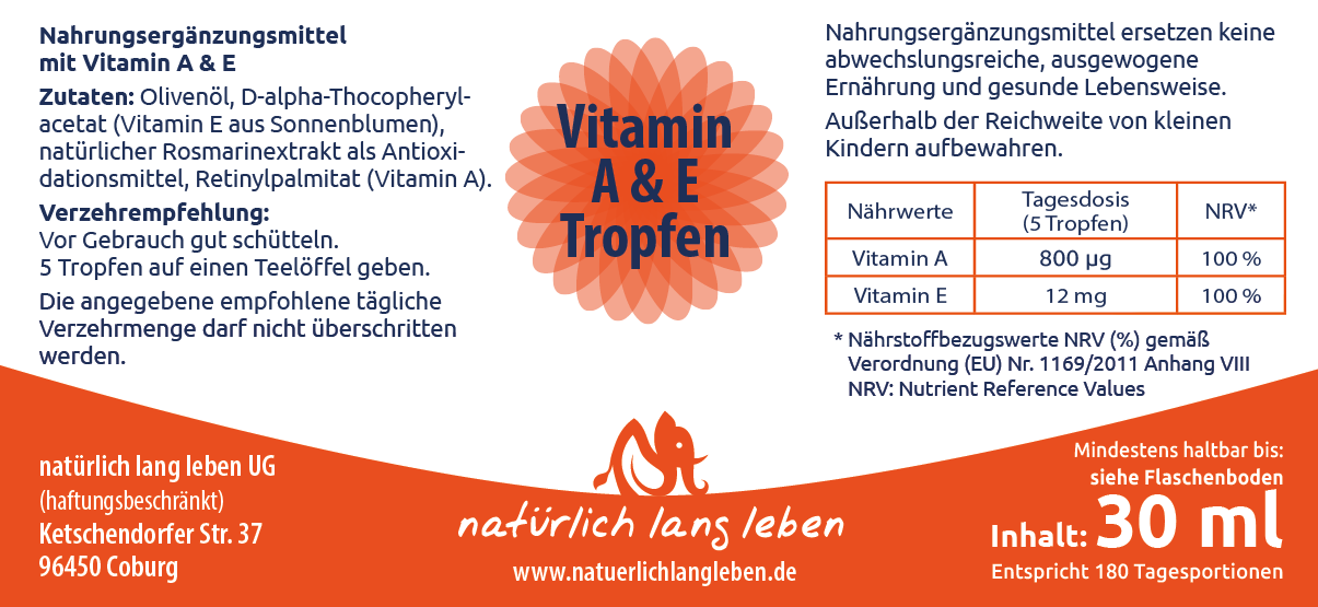 Unsere hochwertigen Vitamin A & E -Tropfen sind pefekt dosierbar und ganz einfach zu nehmen. Höchstmögliche Qualität ist uns wichtig - für Sie! Wir achten immer auf reine Substanzen, deshalb finden wir hier als Trägerstoff Olivenöl - um eine optimale Aufnahme zu gewährleisten, denn Vitamin A zählt zu den fettlöslichen Stoffen.