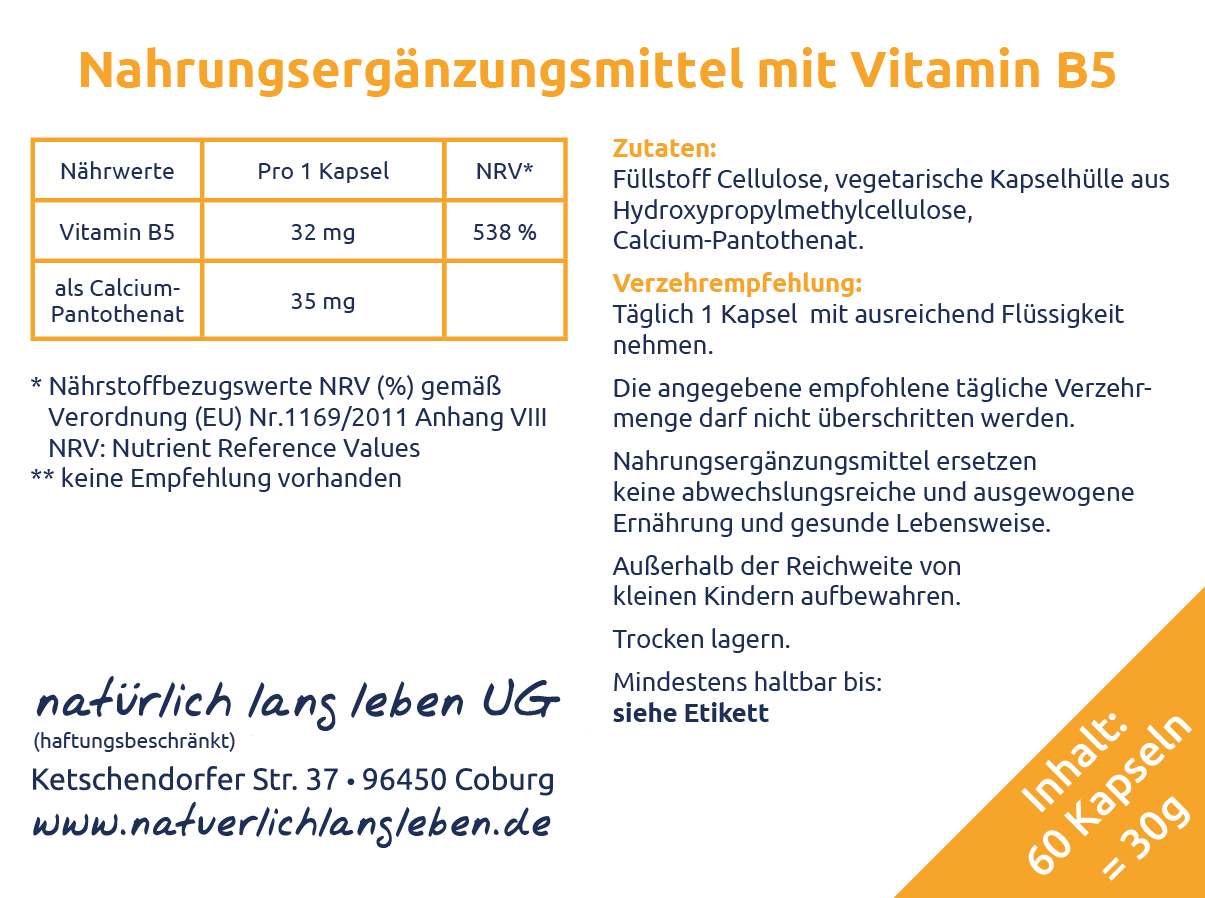Pantothensäure, wie B5 auch genannt wird zählt zu der Familie der B-Vitamine. Unser Körper kann das wasserlösliche Vitamin nicht speichern und ist somit auf eine gesunde Zufuhr angewiesen. Es trägt zu einem normalen Energiestoffwechsel,